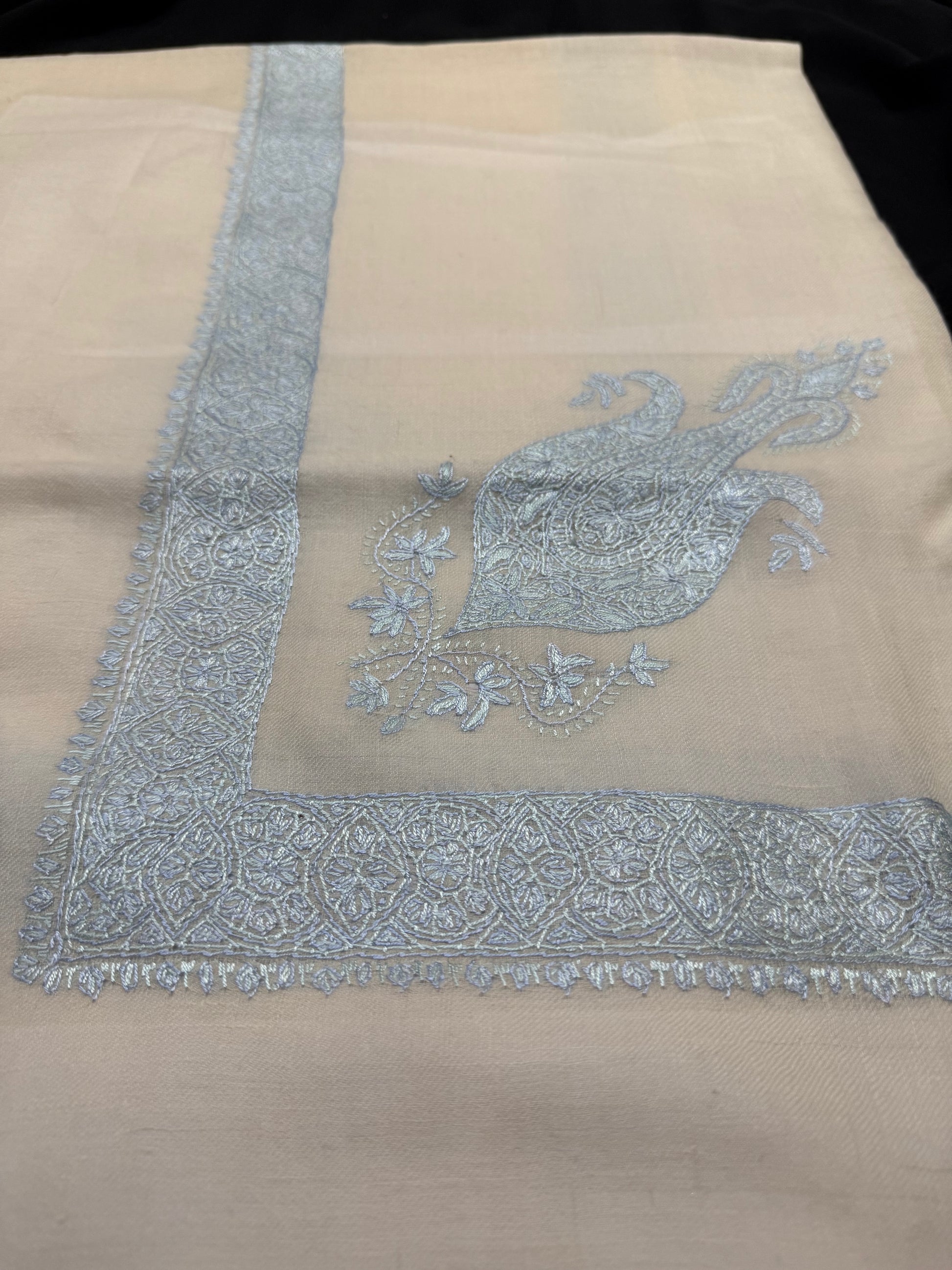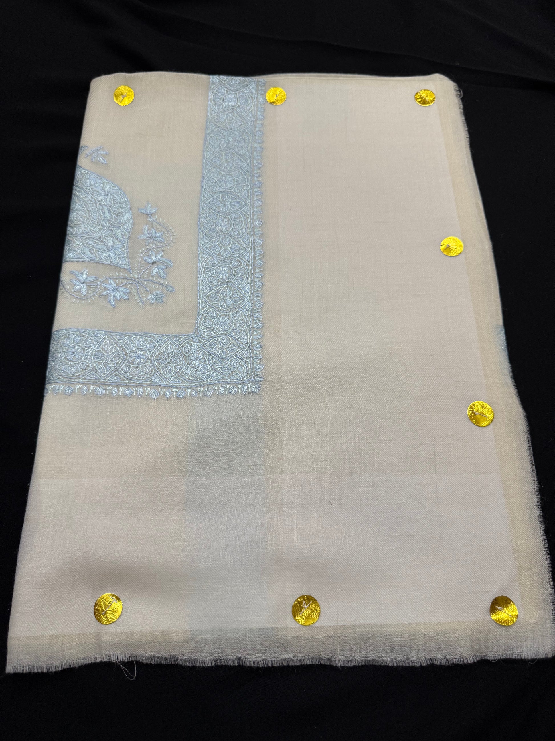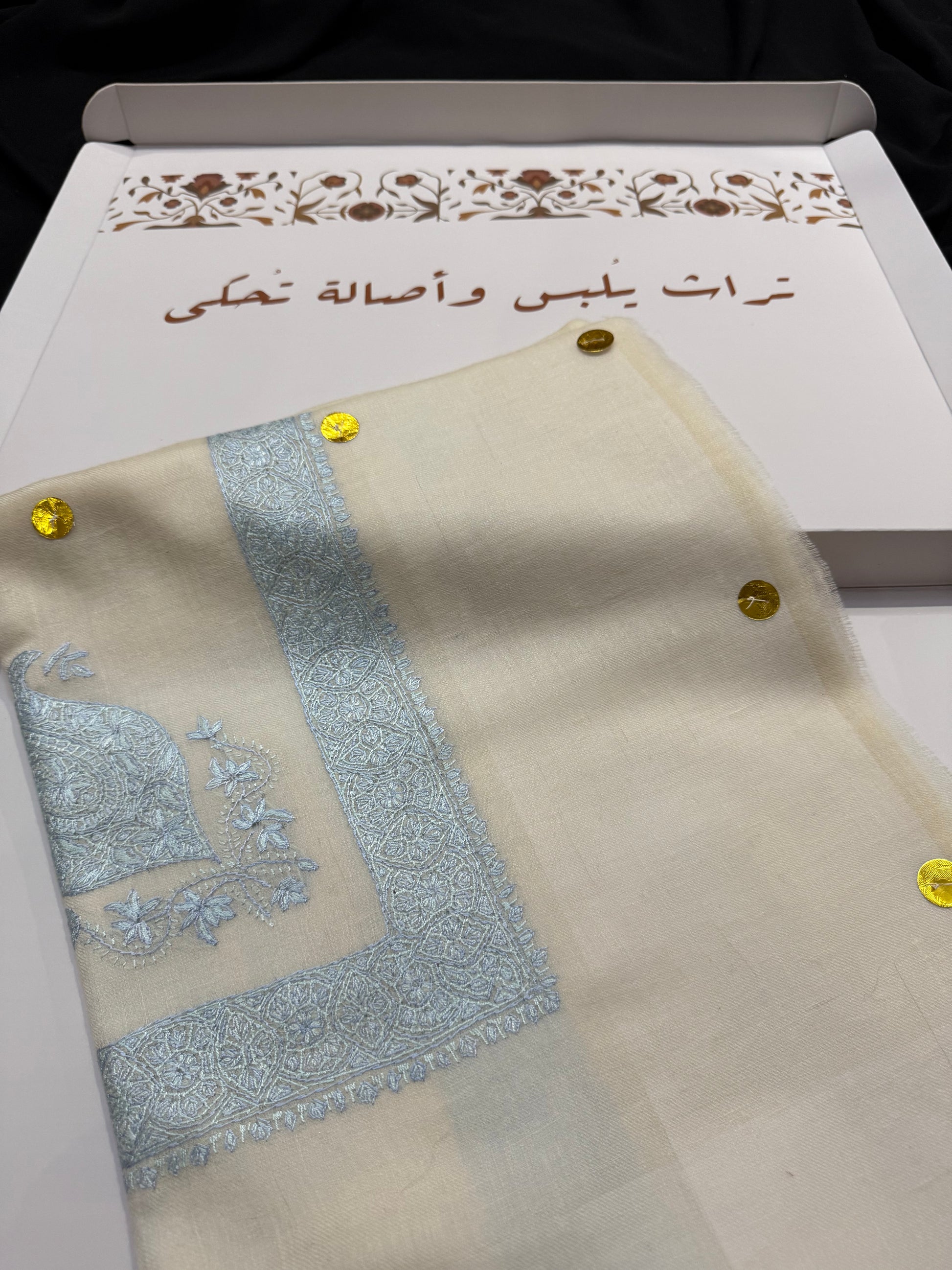 This beige shawl is crafted from 100% hand-woven pashmina and features refined blue embroidery in an elegant Arabic design. Combining luxurious softness with intricate artistry, it offers a sophisticated touch to elevate your style with timeless grace and cultural elegance.