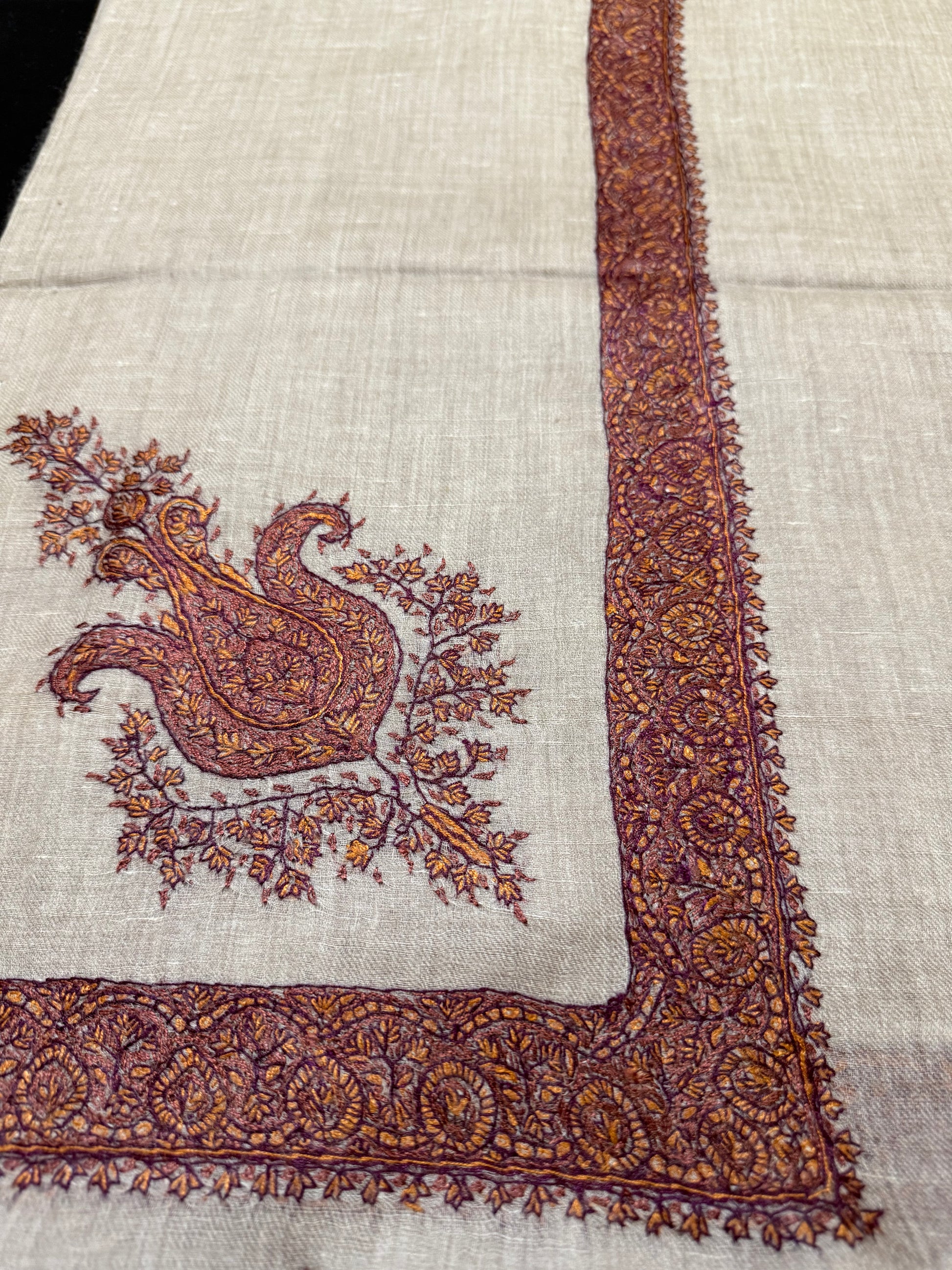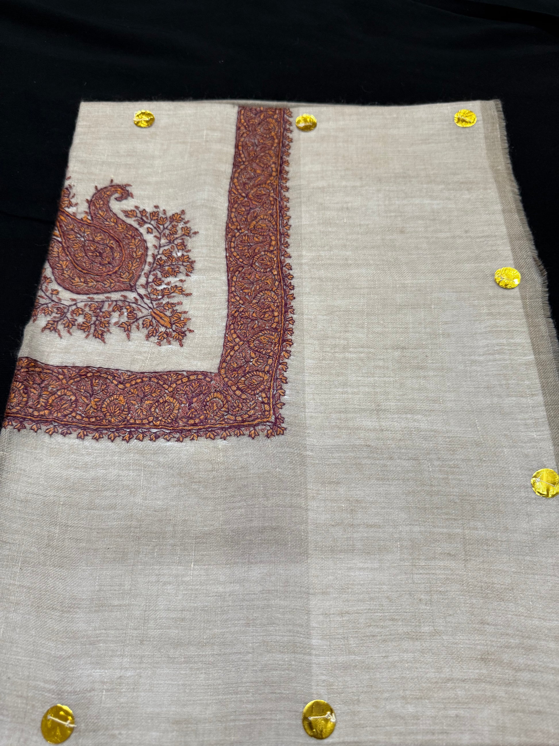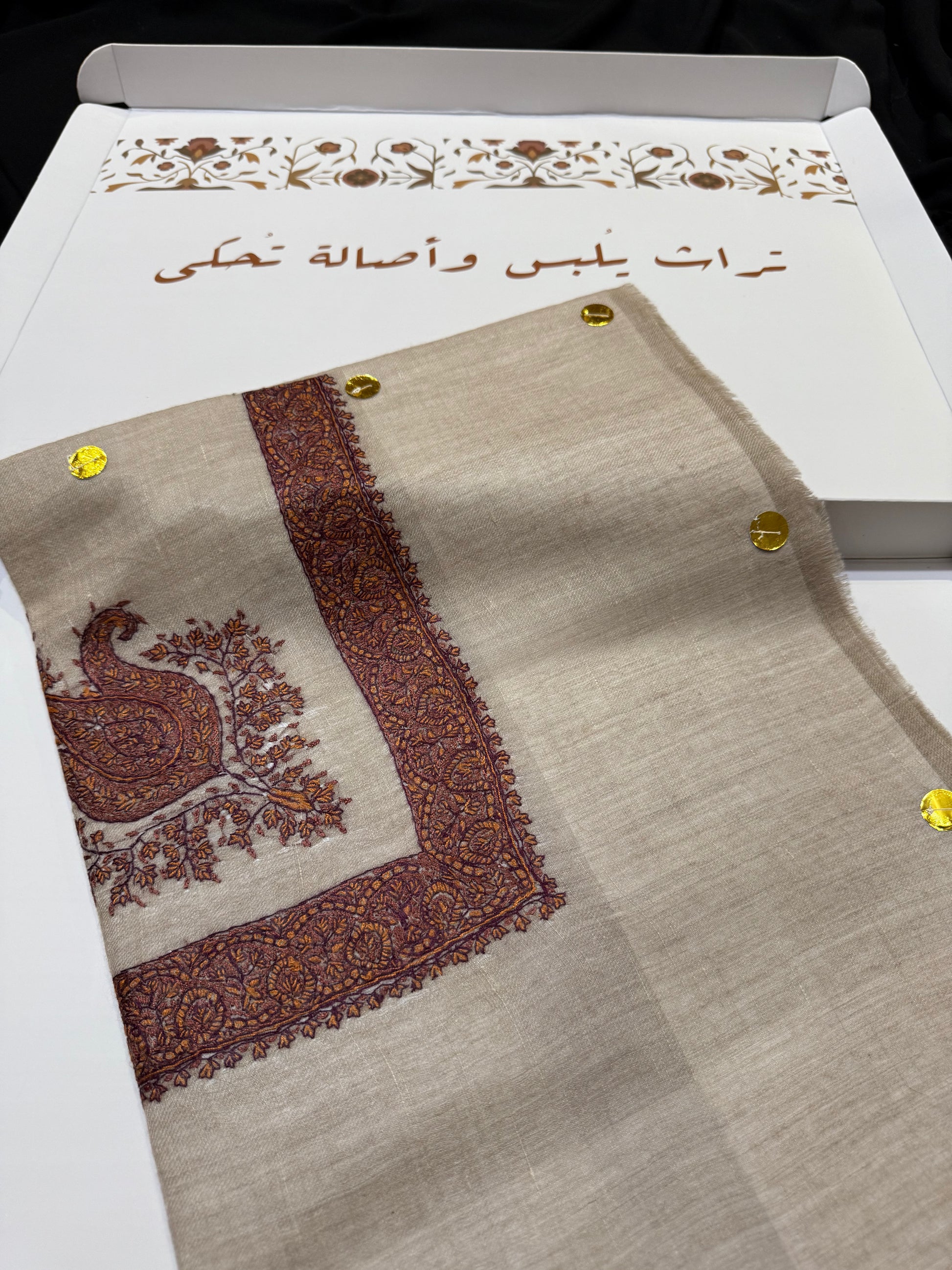 This beige 100% pashmina shawl features exquisite hand-woven craftsmanship, beautifully accented with brown embroidery. Its elegant Arabic design adds a refined touch, perfect for those seeking a sophisticated accessory that blends traditional artistry with timeless style.