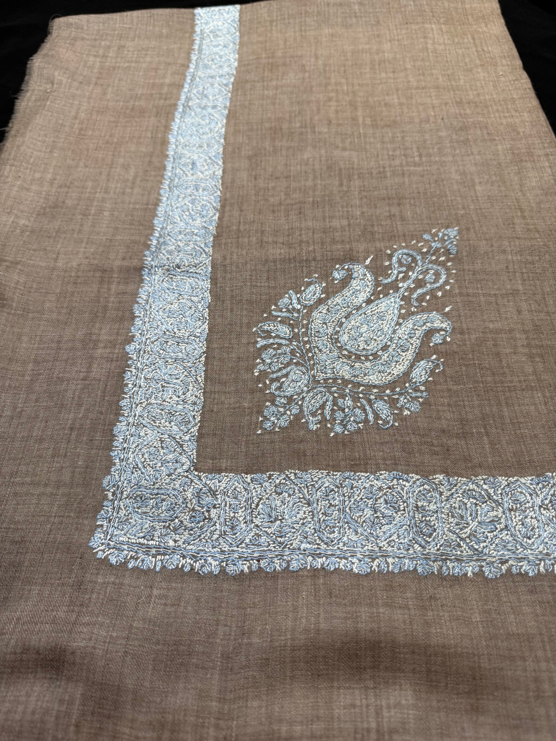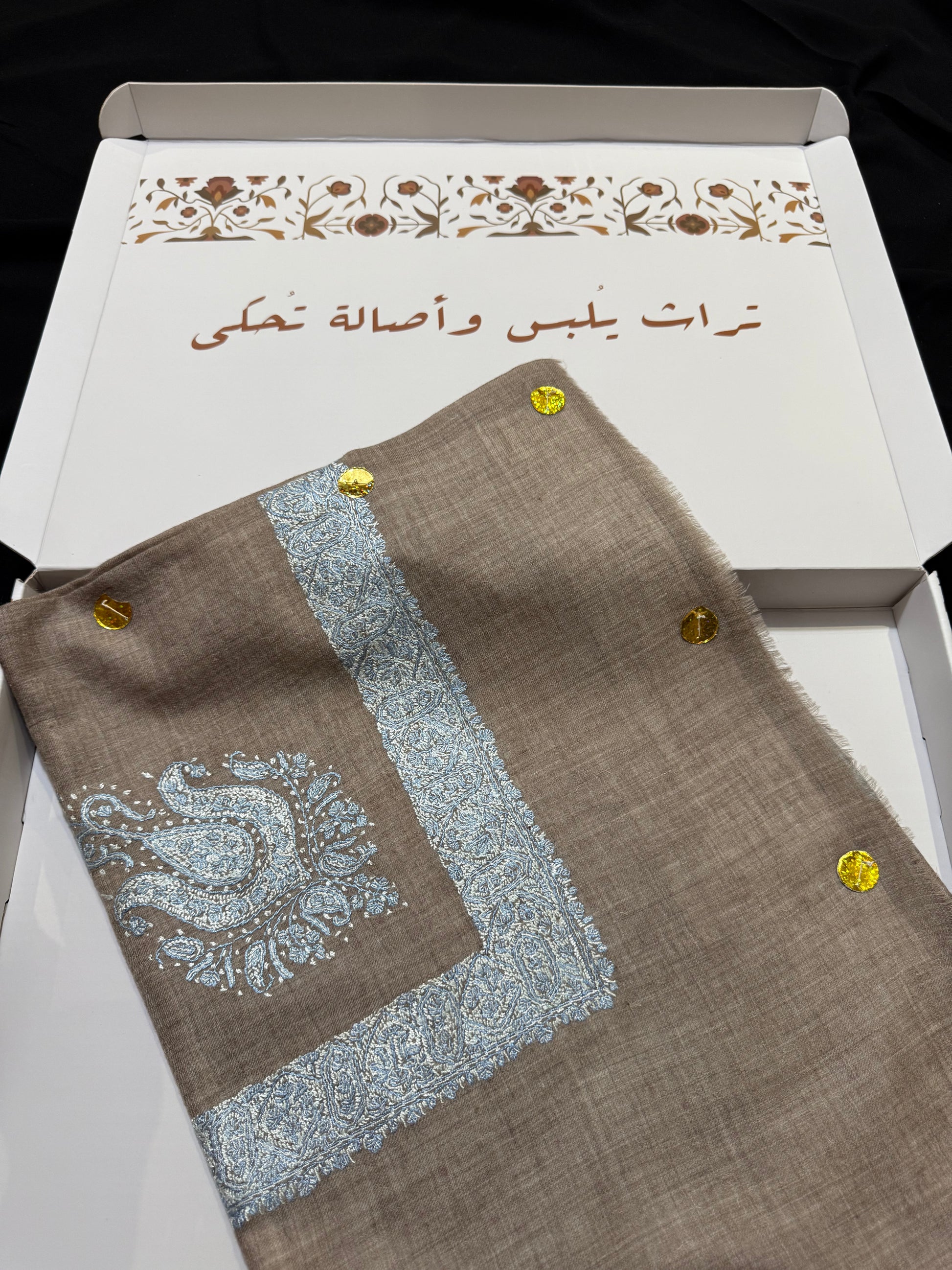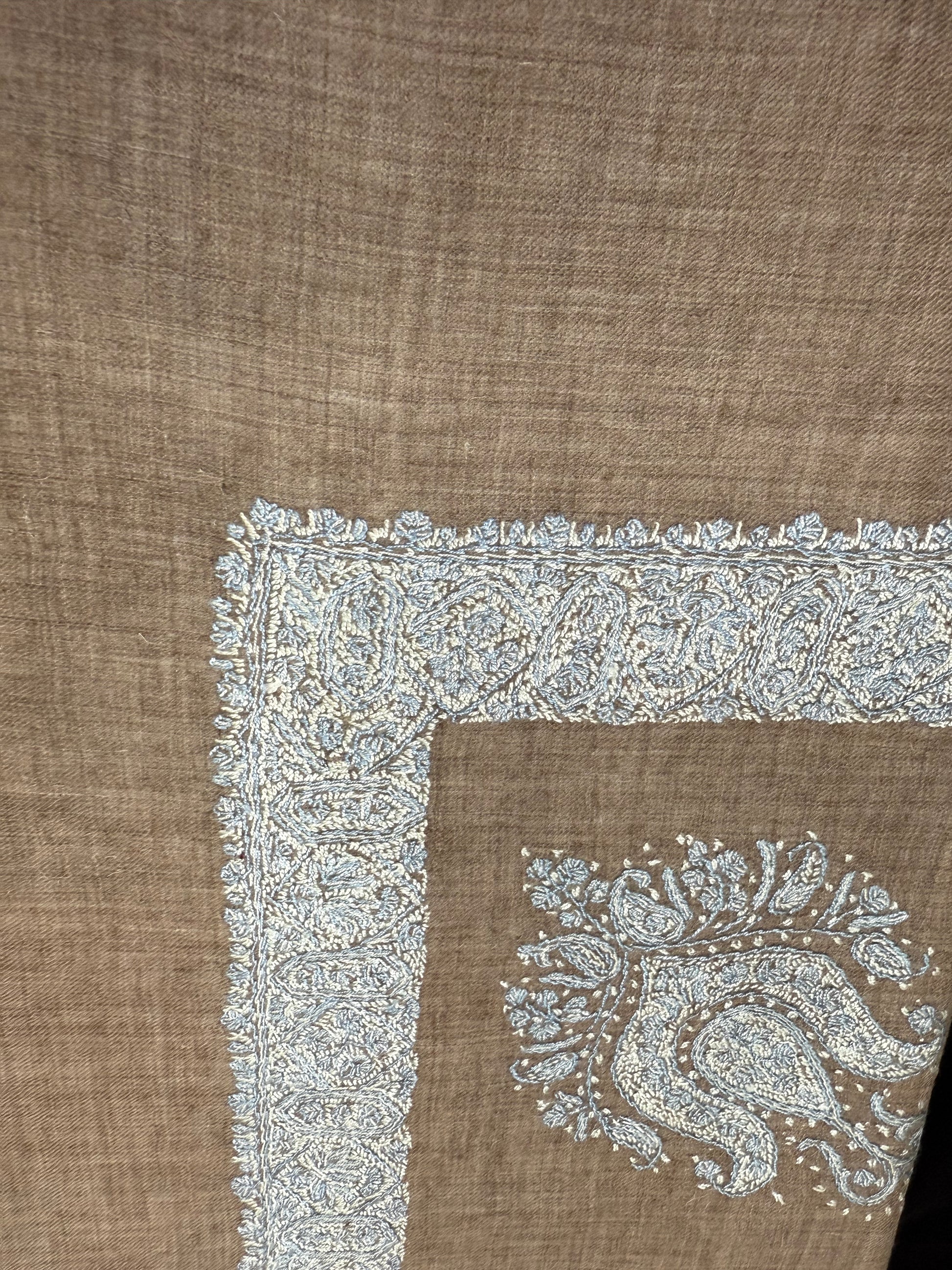 This brown Pashmina shawl, hand woven with delicate blue embroidery, combines traditional artistry with luxurious softness. Its refined design and rich texture make it a sophisticated accessory, perfect for adding elegance and warmth to any outfit.