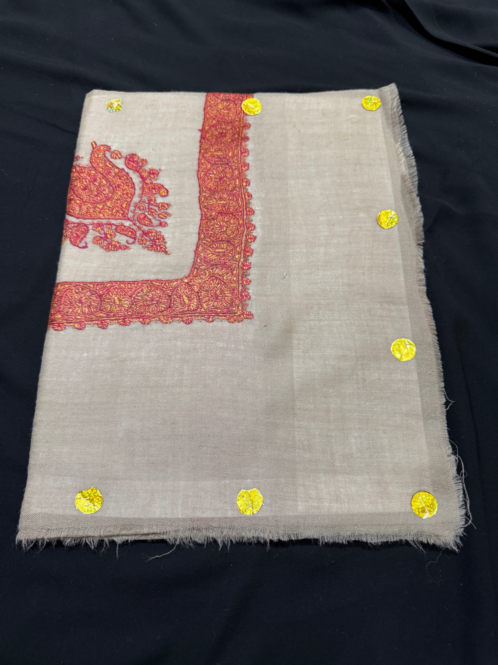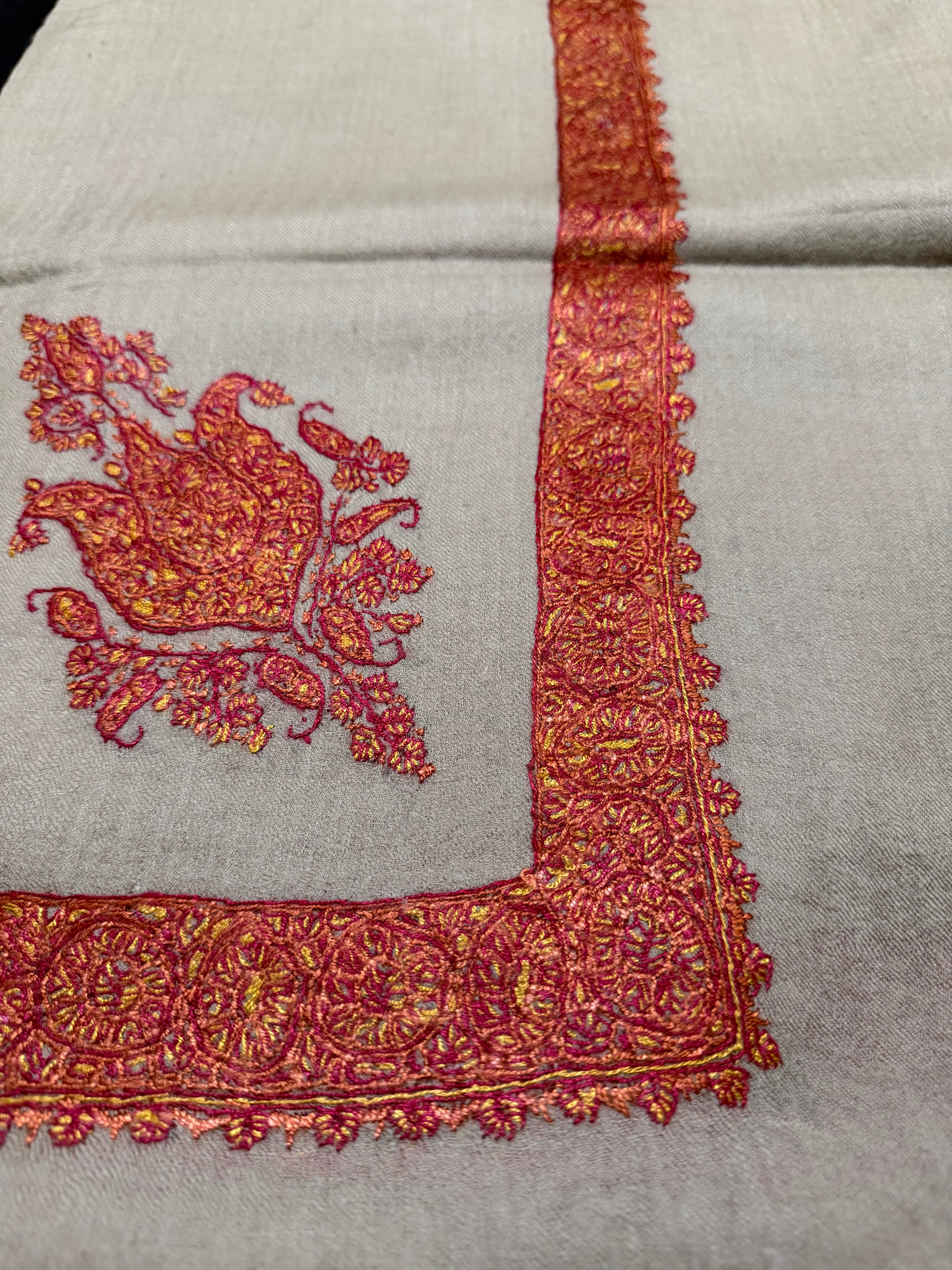 This 100% gray pashmina shawl is hand woven with intricate red embroidery and accented with gold, showcasing an elegant Arabic design. Its refined craftsmanship and luxurious colors create a sophisticated accessory that adds warmth and timeless beauty to any outfit.