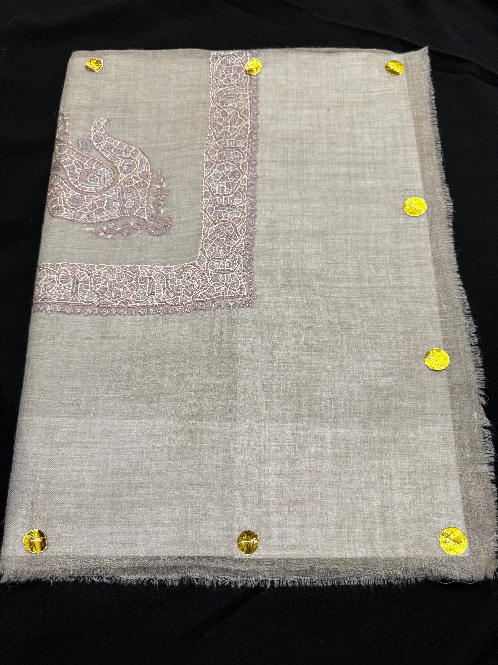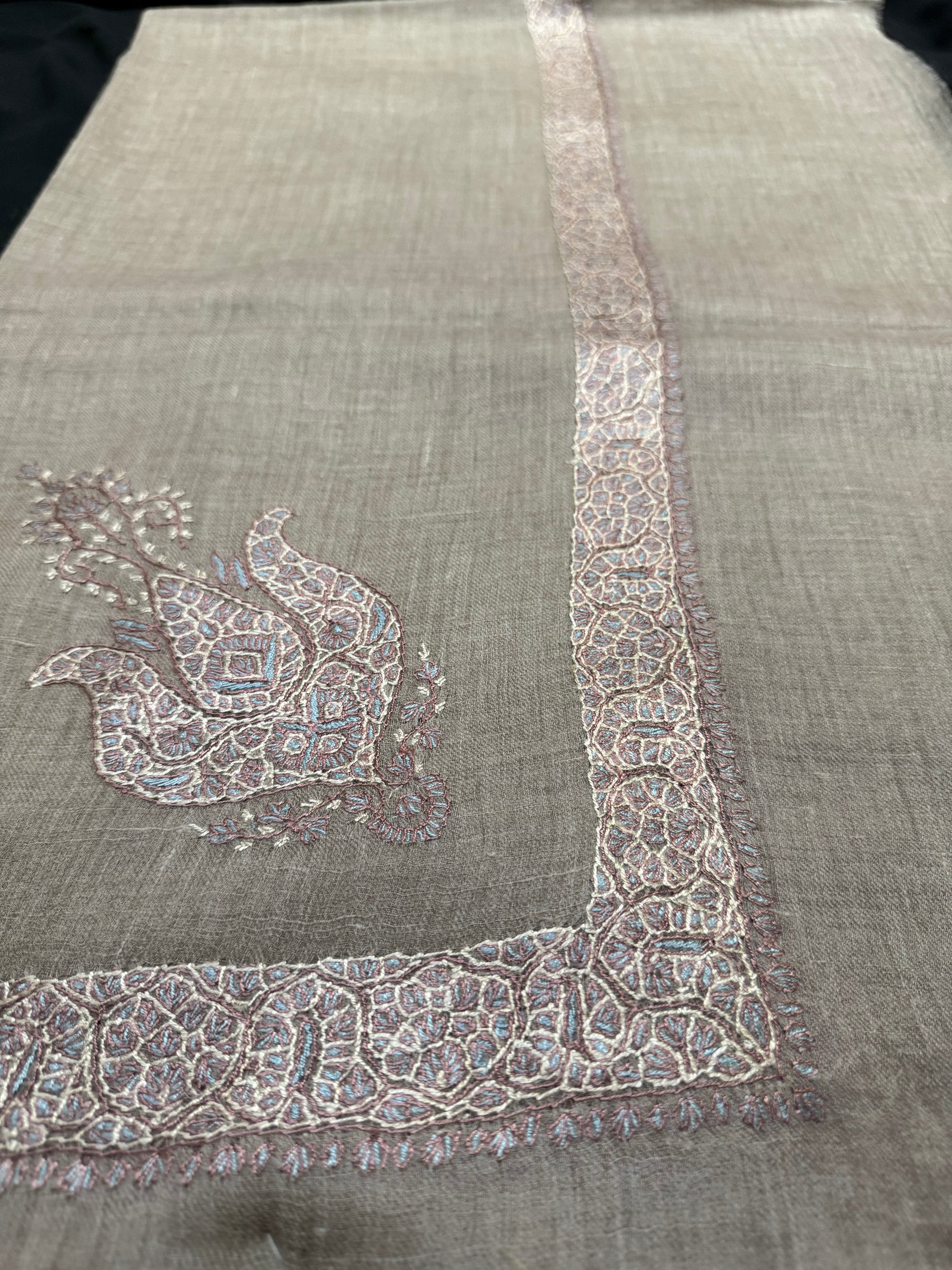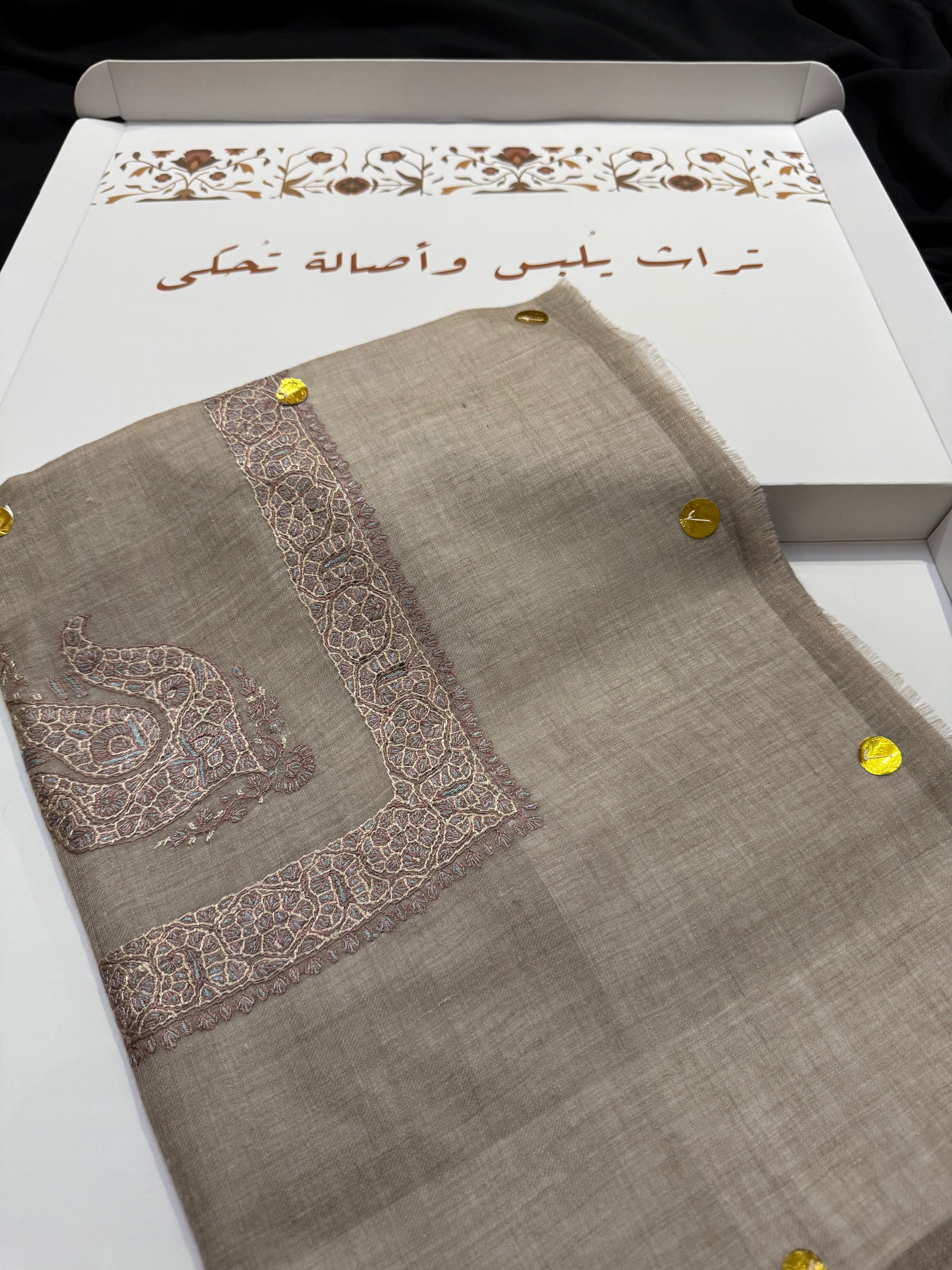 Crafted from 100% pashmina, this taupe shawl features delicate ivory embroidery enhanced by subtle off-white accents. Hand-woven with an elegant Arabic design, it offers a refined touch to any ensemble, combining timeless artistry with luxurious softness.