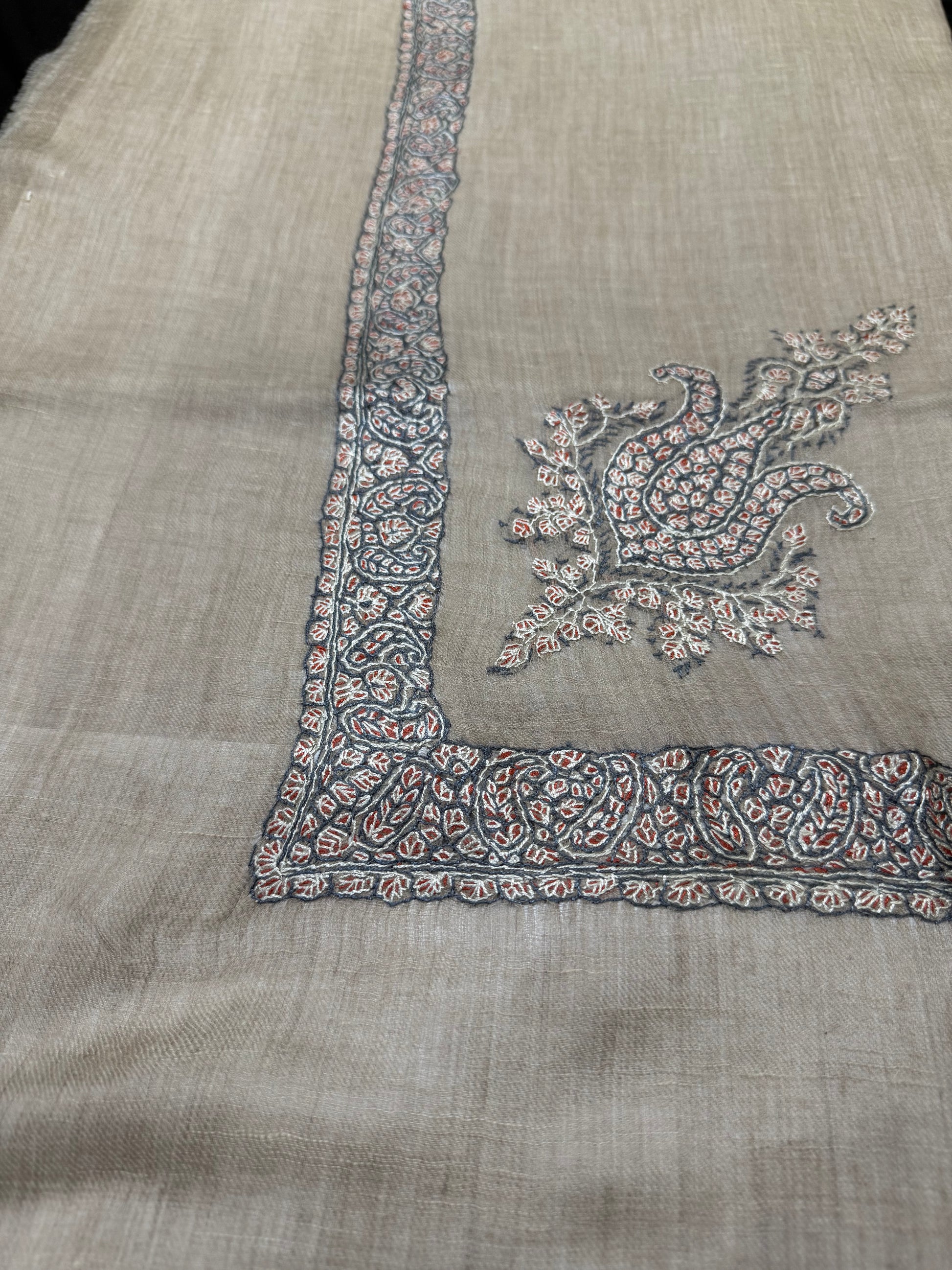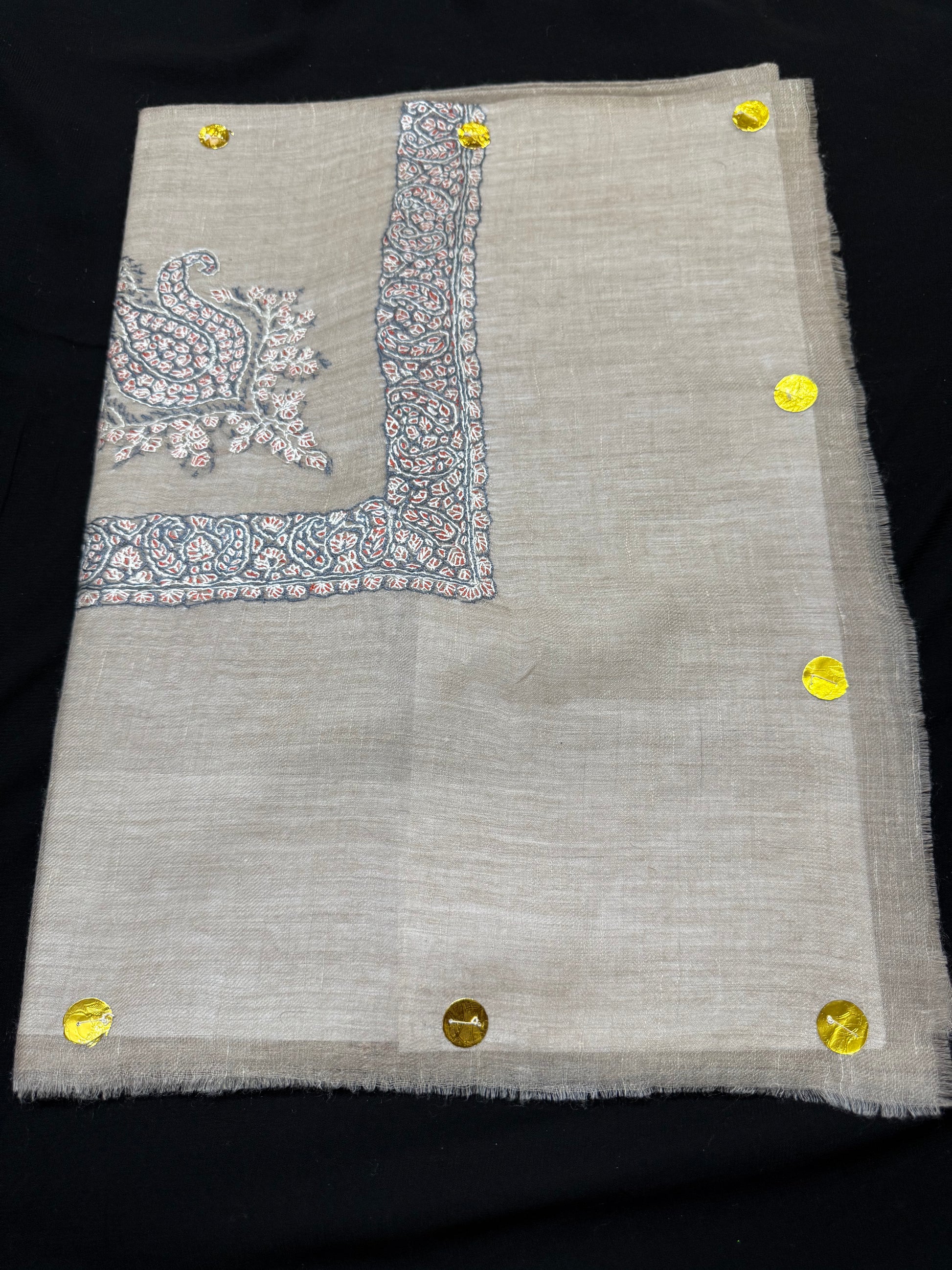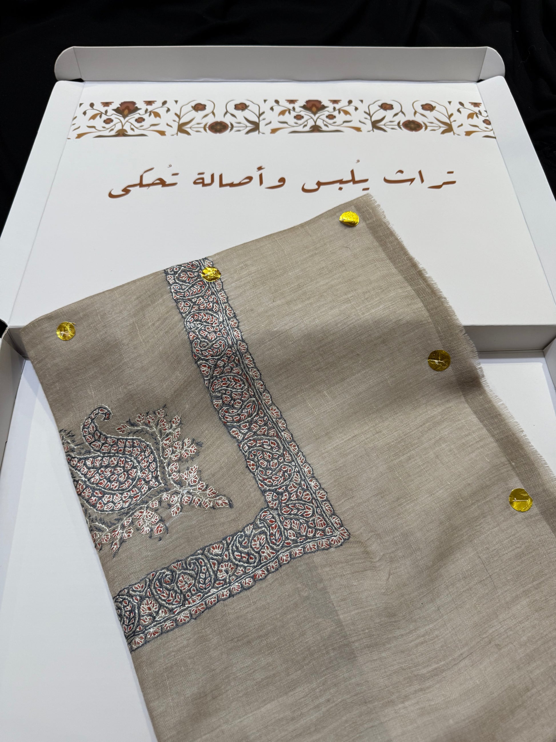 Experience timeless elegance with this 100% Pashmina shawl in a sophisticated taupe hue, featuring intricate teal embroidery and delicate white accents. Handwoven to perfection, its refined Arabic design adds a touch of cultural artistry, making it a graceful accessory for any occasion. Soft, luxurious, and striking, this shawl effortlessly blends tradition with modern style.
