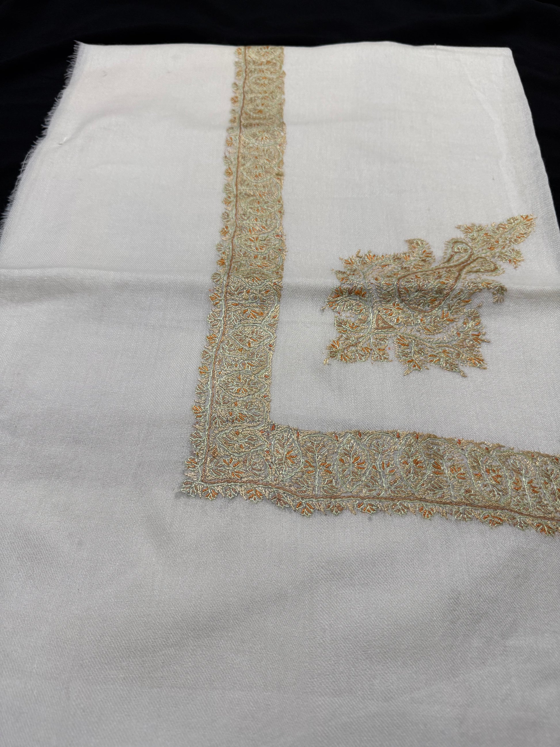 This exquisite 100% Pashmina shawl is hand-woven to perfection, featuring a pristine white base adorned with delicate gold embroidery and vibrant orange accents. Its elegant Arabic design adds a touch of cultural sophistication, making it a refined accessory that complements both traditional and contemporary ensembles with understated luxury.