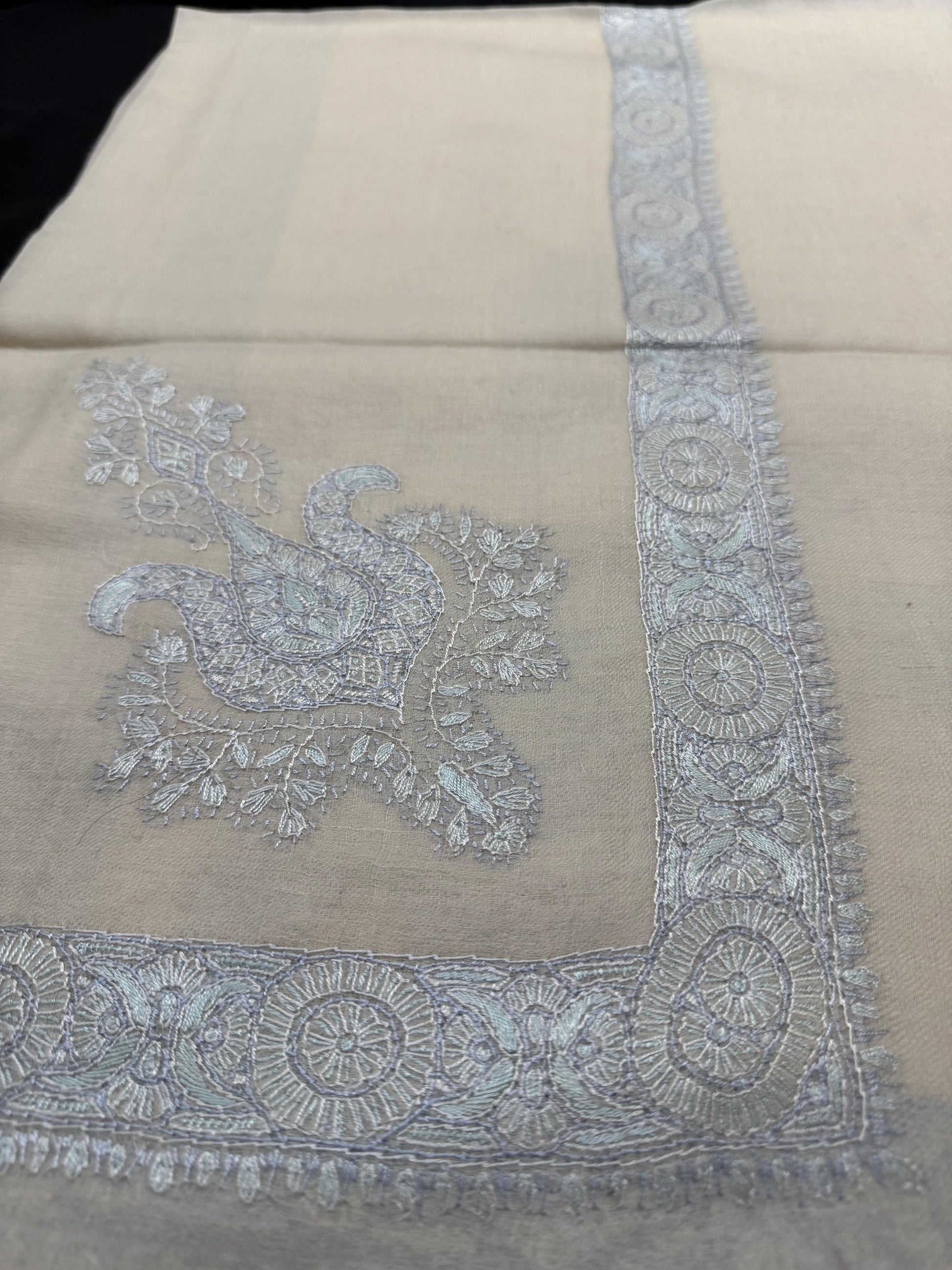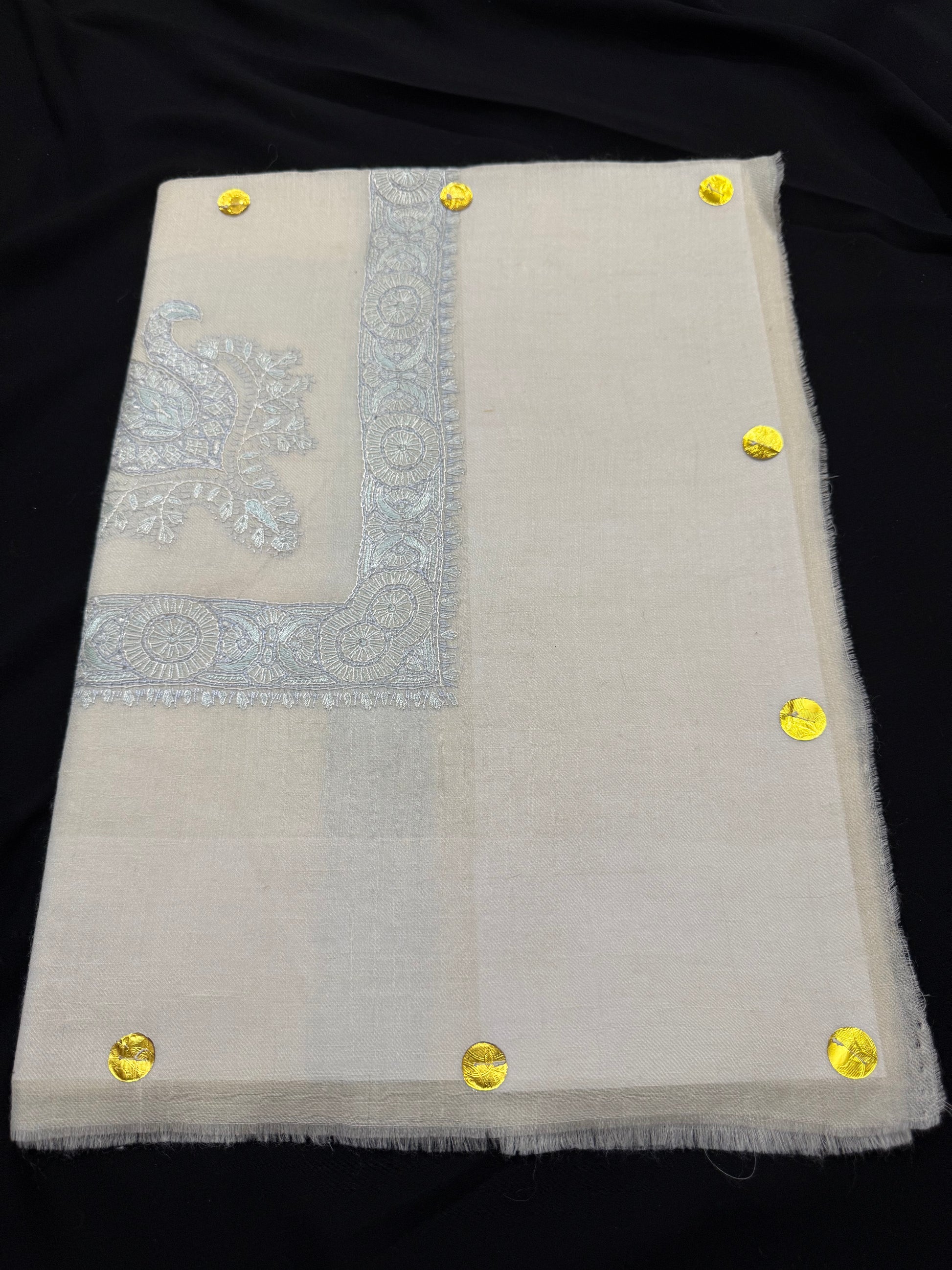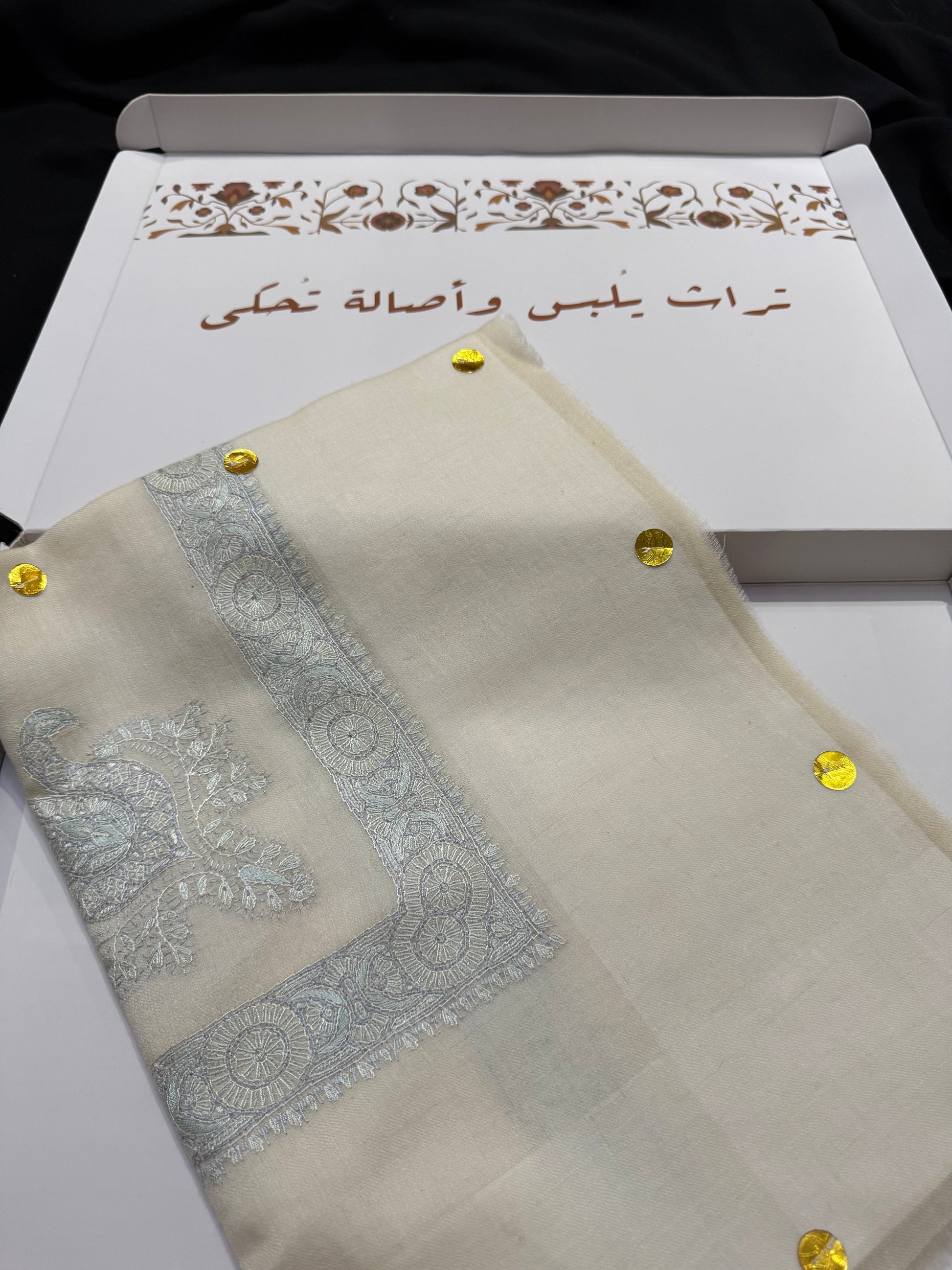 This 100% pashmina shawl in pristine white is expertly handwoven and adorned with delicate light blue embroidery. Featuring an elegant Arabic design, it combines refined craftsmanship with timeless beauty, offering a sophisticated accessory that enhances any wardrobe with subtle luxury and warmth.